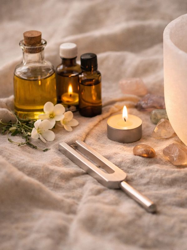 Subtle vibrational elements using tuning forks to encourage relaxation, sensory awareness, and nervous system settling. Often paired with massage or Reiki for a layered wellness experience.